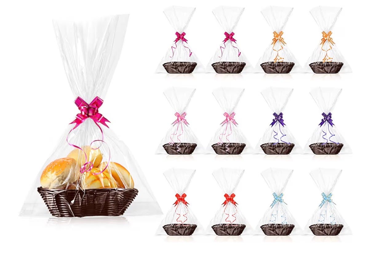 We have a stack of little white gift bags we can use, but I’ve been thinking about switching that up to something more useful post gift receipt. A little basket (ribbon and cellophane included) can always be reused.
